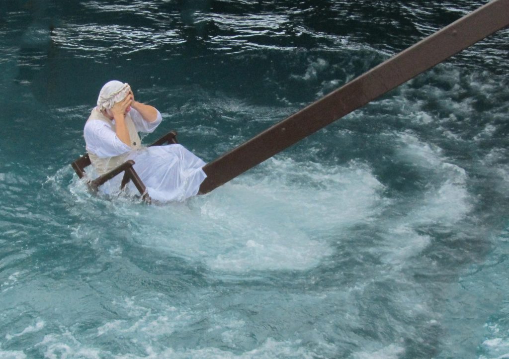 Mechanically, it was made from a wooden chair or plank attached to a long pole, usually on wheels but sometimes stationary by a pond or stream. The miscreant was strapped to the chair and wheeled around the village or town, normally with tomatoes and debris being hurled at them.  Often the punishment ended with just two or three drenchings while the crowd looked on, but occasionally a judge would pass a sentence of a hundred or more. Depending on the water’s depth, it ranged from a cold dip to a dangerous or even fatal experience.